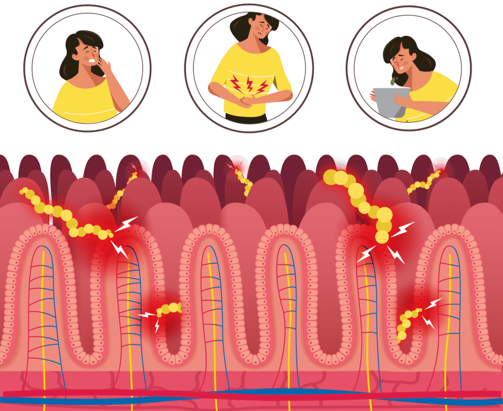 Most people are not affected by undigested gluten peptides. But in those with recognised gluten-related disorders, when the peptides interact with the lining of the small intestine, they can trigger a cascade of events leading to symptoms, inflammation and, in some cases, an autoimmune response that leads to intestinal damage.